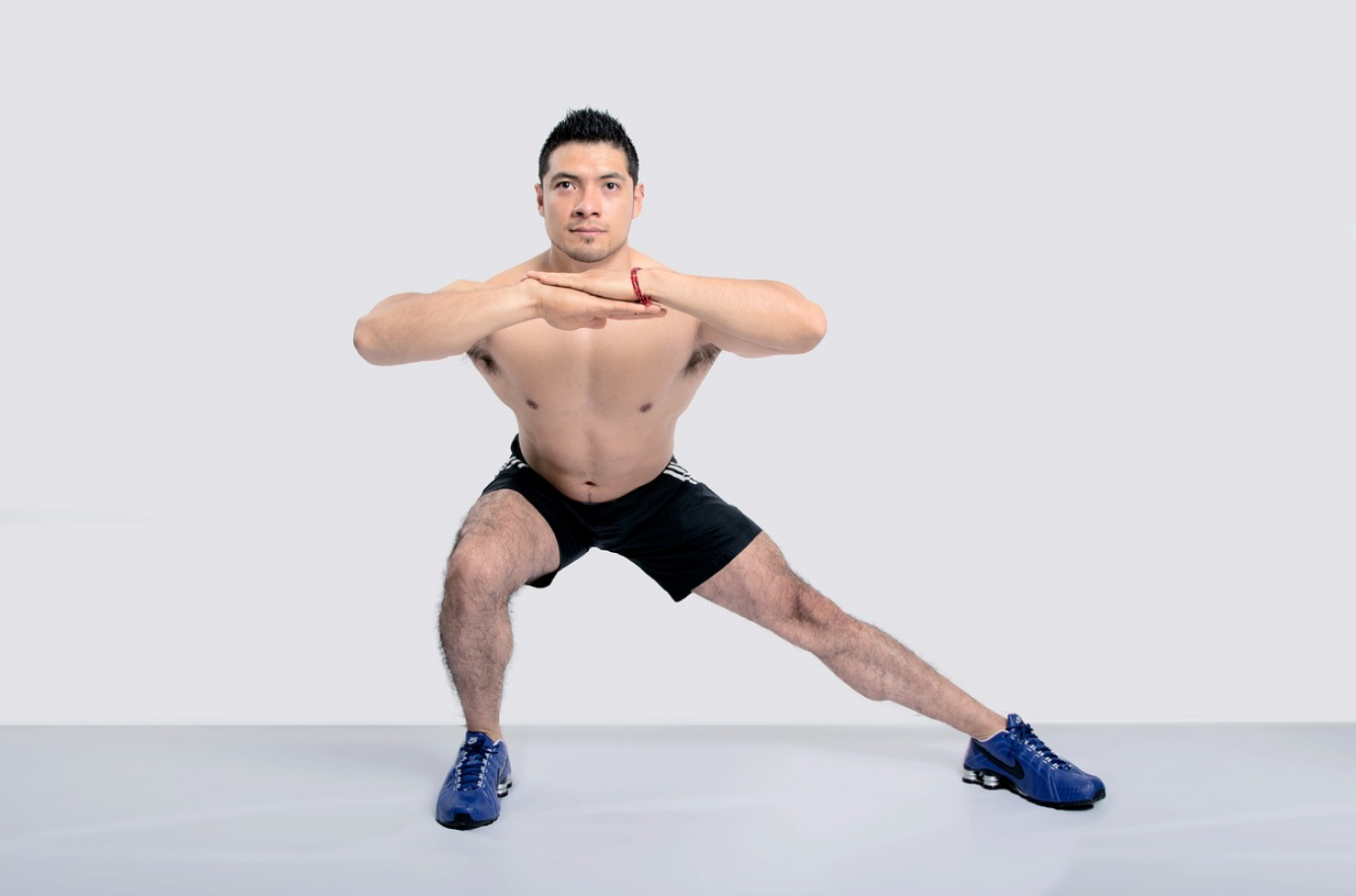 •    방법: 발을 어깨너비보다 넓게 벌리고, 한쪽으로 몸을 낮춘 뒤 천천히 올라옵니다. 좌우 15회씩 3세트 반복.